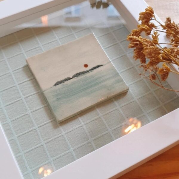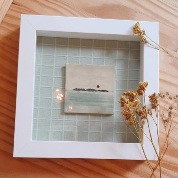 Preciosa pieza de cerámica hecha 100% a mano por Luciérnaga Graphics. Una delicada pieza de cerámica hecha y pintada a mano que decora de manera perfecta con este marquito de madera. Si eres amante de las Cíes, te encanta el mar, y amas Galicia y sus horizontes, este cuadro será perfecto para decorar tu hogar.