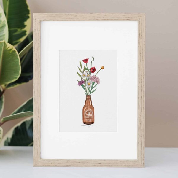 Decora bonito con esta lámina del botellín el Alcazar, ilustrada por La Neilo. Una pieza con alma que une el encanto de los botellines de cerveza vintage con ilustraciones botánicas inspiradas en las flores típicas de cada región.