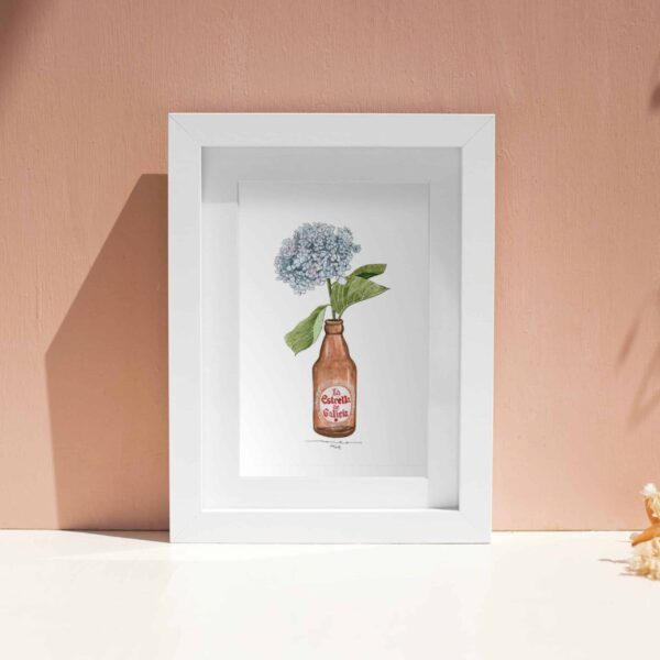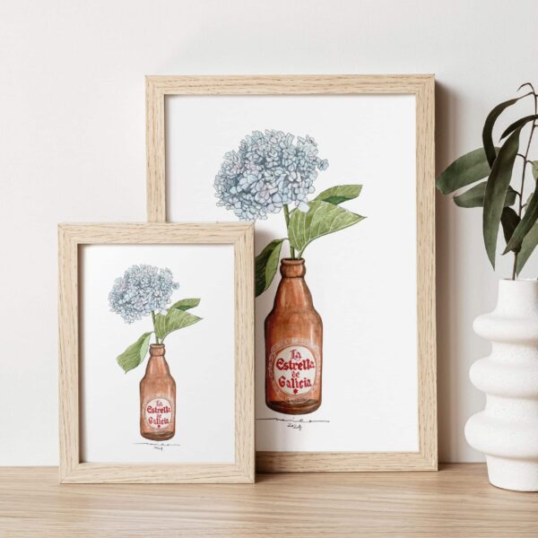 Decora bonito con esta lámina del botellín de Estrella Galicia, ilustrada por La Neilo. Una pieza con alma que une el encanto de los botellines de cerveza vintage con ilustraciones botánicas inspiradas en las flores típicas de cada región.