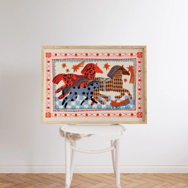 La lámina ilustrada “Caballo rosa corriendo” tiene ese algo que hace que te detengas. La miras. Sigues mirando. Y de pronto ya estás pensando: vale… ¿pero dónde la pongo?