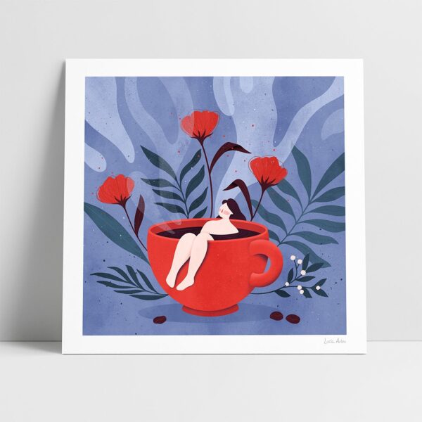 Las ilustraciones de Lucía Antru nos transportan en un abrir y cerrar de ojos a su mundo de fantasía, de ensoñación y de magia, del que ya no podemos salir nunca. Esta maravilla de lámina llamada Cafecito lo refleja perfectamente.