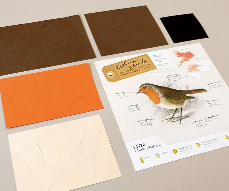 - El kit contiene 4 papeles de arte de pulpa teñida, con un 50% de algodón y resistentes a la luz, una ficha didáctica con las principales características del Petirrojo y unas instrucciones de montaje. Las piezas vienen precortadas y marcadas para facilitar el plegado y el montaje. Todos estos materiales se presentan en una carpeta resistente y atractiva. Se necesita cola blanca de manualidades para pegar las piezas de la figura.